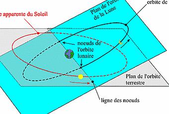 - la Lune et le Soleil sont positionnés à l'intersection de leurs plans orbitaux qui représente une droite que l'on nomme "ligne des noeuds".