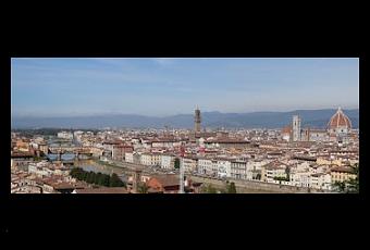 Sur cette vue d'ensemble, on peut distinguer, de gauche à droite, le Ponte Vecchio, la tour du Palazzo Vecchio, le campanile et le dôme du Duomo, la cathédrale de Florence.
