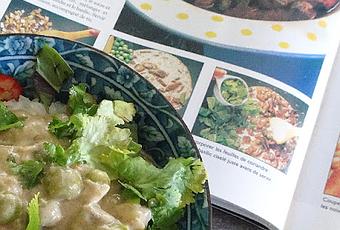 A plusieurs reprises je m'étais arrêtée à cette recette dans le livre "Cuisine thaïlandaise", mais je ne l'avais jamais préparée car il fallait des aubergines thaïes kermit et je craignais de ne pas en trouver ici. Or, je me suis rendue récemment dans une épicerie thaï à Perpignan où j'ai découvert ces aubergines que j'ai achetées en espérant me rappeler où j'avais bien pu voir cette recette. Mais j'ai eu de la chance et je l'ai retrouvée rapidement.