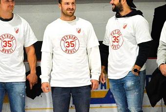 Tous portaient un chandail spécial pour souligner les 35 ans de carrière de Pierre Petroni dans le hockey.