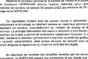 Après l’incendie déclenché en matinée au siège de la Société de presse et d’édition du Cameroun ( Sopecam ) à Yaoundé, la directrice générale de cette société d’État, Marie Claire NNANA, vient de commettre un communiqué de presse.