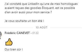Voici un exemple avec un câble chargeur USB que j'ai offert à un prospect, et qui désormais l'accompagne partout, voici son message sur Linkedin avec une photo :