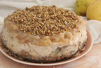 Préparer la gelée de poire : Eplucher les poires, les couper en petits morceaux et les écraser à la fourchette ou au mixer. Ajouter l'agar-agar. Verser dans une casserole et porter à ébullition pendant 1 minutes. Laisser tiédir quelques minutes, puis verser sur le cheesecake refroidi. Réserver au frais au moins une nuit. Au moment de servir, décorer avec le granola de sarrasin (ou les miettes de spéculoos).