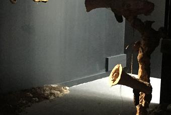 Le collectif Fibra a réalisé une installation faite de haut-parleurs et de sculptures en cosses de maïs et son de blé inoculé avec du mycélium de Ganoderma Lucidom et des pleurotes.