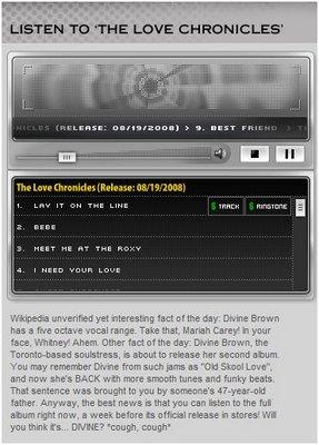 Nous vous avons longuement parlé de Divine Brown sur Mysoul.fr, et de la sortie de son album "The Love Chronicles". Grâce au site de Much Music, vous pouvez désormais écouter en intégralité le 2e album de l'artiste canadienne, qui ne déroge pas à la grande tendance du moment, le style retro soul évidemment ! Si le réjouissant "Bebe" semble tout droit sorti de la B.O de "Cry Baby" ou de "Hairspray", "Next Best Thing" ravira les amateurs de sonorités plus actuelles, "One More Chance" fera fondre les amateurs de ballades acoustiques plus classiques, et les nostalgiques des 90's retrouveront un peu de l'esprit de Brownstone sur "It's Over".