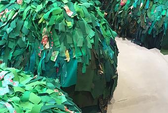 Une pyramide de nuggets se dresse, à la sortie de l’exposition, sur un lit de plumes blanches. Cette oeuvre de Thierry Boutonnier vous invite à ne plus regarder vos assiettes de la même façon. Vous vous demanderez combien d’arbres ont été abattus pour les remplacer par du soja, principale nourriture des volailles en élevage industriel…