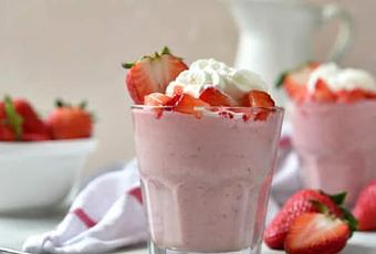 Cette mousse est faite de fraises fraîches, servie avec une crème fouettée.