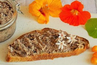 Tartinez le pâté végétal sur du pain (ici, c'est au levain naturel). Accompagnez-le de tomates et de fleurs.