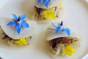 J'ai fait un chaud-froid pour obtenir un contraste : la " pâte" des ravioles est composée de fines tranches de radis et, à l'intérieur, j'ai cuit une farce composée de radis râpés, d' oseille sauvage (au goût citronnée, ce qui fonctionne très bien avec le radis) et de champignons déshydratés (en se réhydratant, ils vont absorber la saveur des autres ingrédients). J'ai terminé avec des fleurs de roquette (au goût piquant) et des fleurs de bourrache.