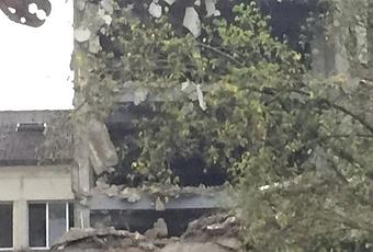 Un engin grignote le bâtiment. On projette de l'eau pour éviter la poussière. Jour après jour, les murs sont détruits. Sur ces photos, c'est à Ivry-sur-Seine (94).
