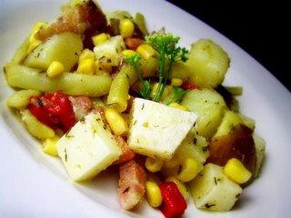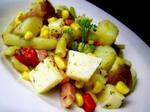 Couper les pommes de terre en dés sans les peler. Mettre les dés de pommes de terre et les haricots verts dans un saladier. Ajouter les lanières de poivron, le maïs, les dés de feta et les lardons. Mélanger.