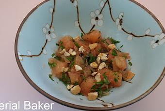 J'aime beaucoup les herbes aromatiques fraîches, mais parfois il y en a trop dans un bouquet. Pour utiliser un reste de coriandre, j'ai décidé d'en parfumer une salade de pamplemousse. J'ai également ajouté de la menthe fraîche. Les herbes apportent de la fraîcheur au pamplemousse et leurs saveurs se marient bien. J'ai également utilisé des noisettes concassées pour apporter une touche de croquant à mon dessert.