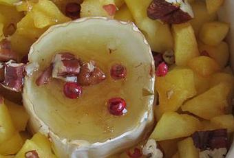 2) Répartir les dés de pommes dans une cocotte. Ajouter le morceau de chèvre, les baies roses, les noix hachées et le sirop d'érable
