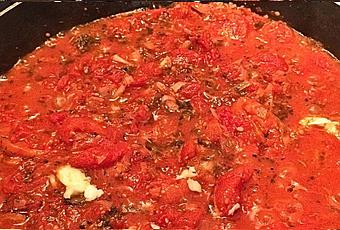 - Attention, l'ail brûle rapidement, ne le laissez pas bruler! Verser les tomates concassées grossièrement, le piment, l'origan et le sel.