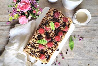 Pour le crumble : 50 g de sucre complet rapadura, 70 g de beurre à température ambiante, 100 g de farine Pour le cake : 40 g de beurre mou, 75 g de farine, 50 g de sucre en poudre, 1 œuf, 1 c. à café de vanille liquide, 1 càc de levure chimique (1/2 paquet),1 pincée de sel, 1 càc bicarbonate alimentaire, 70 g de crème fraîche liquide, 100 g de pépites de chocolat noir. Pour la garniture : 225 g de framboises fraiches ou décongelées.