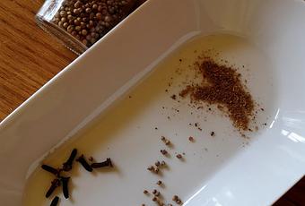 10g de graines de cumin, 5g de bâton de cannelle, 5 g de clous de girofle, 1 étoile d'anis étoilé, 40 graines de cardamome verte, 2g de piment, 5g de poivre noir en grains, 3g de graines de coriandre,