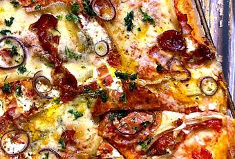 4 – Répartir le fromage sur toute la pizza ainsi que la charcuterie. Répartir la crème en faisant d’un petit tas sur le toute la pizza. Parsemer de nouveau d’origan et de rondelles d’oignons rouges.