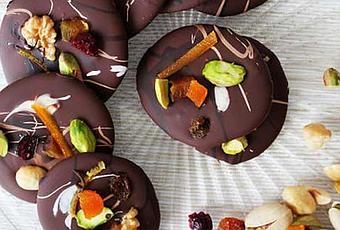 Voici la recette des mendiants version allégée, des petits palets chocolatés ornés de fruits secs variés facile et simple à réaliser.