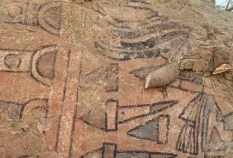 Connu sous le nom de Huaca Pintada, le mur de 30 mètres de long peint d'images représentant des scènes mythiques a été découvert pour la première fois en 1916 par une bande de pilleurs de tombes à la recherche de trésors à Illimo, près de la ville de Chiclayo.