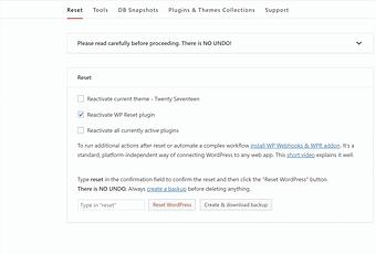 WP Réinitialiser prétend être «l’outil de réinitialisation WordPress le plus avancé». Il est suffisamment gratuit et convivial pour que les non-développeurs puissent l’utiliser pour nettoyer une base de données en un seul clic.