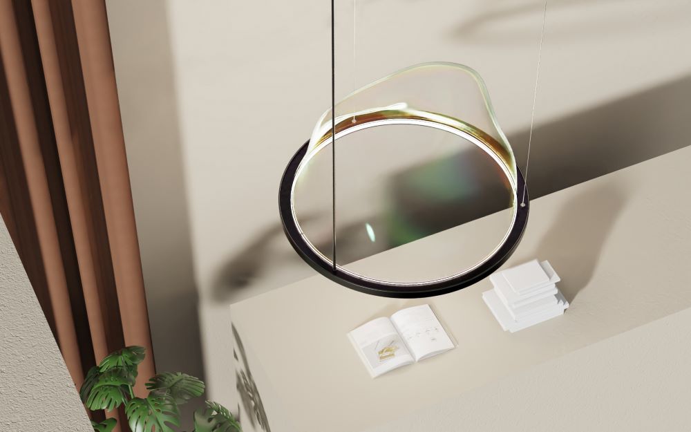 Pour donner vie à cette création, le studio Sunriu Design a choisi le verre soufflé pour la bulle et le métal pour l’anneau qui la soutient. Le verre irisé donne vie à ce luminaire qui dégage ainsi tous ses reflets, à la manière des bulles de savon.