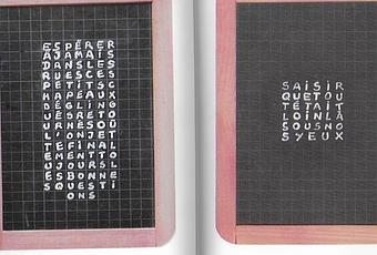 Une exposition Franck André Jamme avait lieu à la galerie Christian Berst jusqu’au 20 novembre 2022 : « Tout était loin là sous nos yeux ». Plusieurs évènements s’y sont déroulés dont, notamment, un hommage par les Souffleurs reprenant des textes du recueil publié par les éditions Isabelle Sauvage, « Au secret ». Il y eut aussi la présentation du livre publié par cette même maison d’édition , « Les ardoises de Franck André Jamme » présenté par Nicolas Pesquès, son auteur. Ce sont de courts textes, dont la plupart commencent par un verbe à l’infinitif, écrits sur des ardoises quadrillées, que Franck André Jamme offrait à des ami.e.s. Isabelle Sauvage estime à plus de 100 le nombre d’ardoises réalisées par le poète. Le livre en contient une partie et les textes qu’on peut y lire, même courts, sont inépuisables. C’est de ce livre que vient l’image ci-dessous.