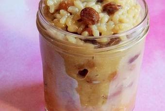 Prenez 2 bocaux. Répartissez la compote dans le fond. Ajoutez le riz au lait (j'ai mis le reste dans un petit bocal). Il est bien crémeux !! Laissez refroidir et entreposez au réfrigérateur, pendant au moins 2 heures avant dégustation.