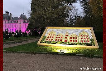 Revenons en plein jour. Une fois la grille d’entrée franchie on découvre la maquette du château qui, après les courges d’Hallowwen est composée de boules de Noël qui scintillent la nuit.