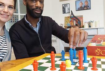 Colombes, le 8 décembre 2022. Aurélie et Toll Dibaya ont créé le Chessball, un jeu de société s'inspirant des échecs et du foot - Photo © Olivier Bureau / Le Parisien