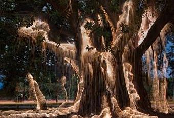 L’artiste illumine la cime des arbres et leurs branches, formant des paysages à la fois mystérieux et oniriques où les couleurs et les bâtiments éveillent sa curiosité.