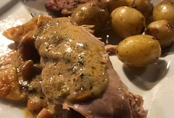 Servir avec des pommes de terre grenaille cuites à l’étouffée à la fleur de sel et lustrées au beurre avant de servir et des châtaignes sautées au beurre et aux échalotes.