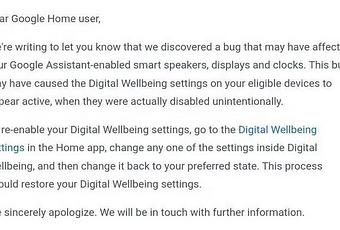 Google puis ajouté un peu plus de détails dans un deuxième e-mail de l’équipe Google Nest, faisant référence à un problème avec son assistant virtuel. L’e-mail indique que le bogue découvert par Google a eu un impact sur les haut-parleurs intelligents, les écrans intelligents et les horloges compatibles avec Google Assistant. L’e-mail poursuit en notant que le bogue a fait apparaître les paramètres de bien-être numérique sur l’un des appareils susmentionnés alors qu’ils étaient en réalité “désactivés par inadvertance”. L’unité Alphabet explique ce que les utilisateurs doivent faire : “Pour réactiver vos paramètres de bien-être numérique, accédez aux paramètres de bien-être numérique dans l’application Accueil, modifiez l’un des paramètres dans Bien-être numérique, puis remettez-le à votre état préféré. Ce processus devrait restaurer vos paramètres de bien-être numérique. Nous nous excusons sincèrement. Nous reviendrons avec de plus amples informations.”Voici ce que fait l’application Android Digital Wellbeing