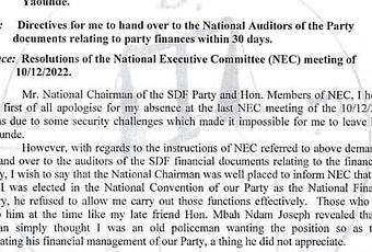Le secrétaire financier national du SDF dénonce les violations des statuts du parti par le chairman et surtout la mauvaise utilisation des fonds en complicité avec le trésorier adjoint du parti.