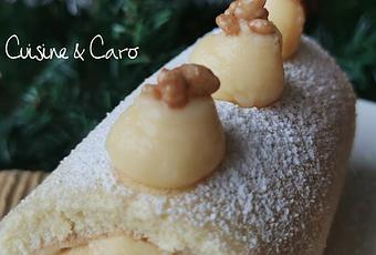 4. Rouler, puis saupoudrer de sucre glace et décorer avec un peu de reste de crème citron et de riz soufflé praliné. Réserver au frais.