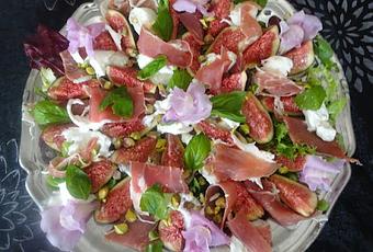 Le jour de Noël j'étais invitée pour le déjeuner et comme je n'aime pas arriver les mains vides j'ai proposé d'apporter des salades, dont celle-ci. J'avais préparé toute la salade sur le plat de service et préparé la vinaigrette à part. J'ai eu du mal à trouver des figues, pourtant on propose beaucoup de recettes pour les fêtes avec des figues. Mais j'ai trouvé une astuce pour ne pas me rendre aux magasins pour rien : je regarde sur leur site drive et c'est ainsi que j'ai su que tel hypermarché en avait. J'ai décoré la salade avec des fleurs comestibles.