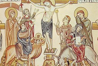 La polarité Eglise-Synagogue s’est mise en place plus tard, à l’époque carolingienne. Là encore la position de l’Eglise est contrainte par la position de la plaie puisqu’elle recueille le sang du Christ dans son calice.