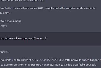 Ceux qui ont testé l’application (en s’inscrivant ici par exemple) ne pourront qu’admettre l’écart maintenant stupéfiant qu’il y a entre ChatGPT et les précédents robots d’interaction fournis par certaines entreprises pour s’éviter un service clientèle coûteux. Non seulement, la conversation semble fluide, mais les réponses sont pertinentes et, à l’occasion, le robot peut même faire preuve d’humour :
