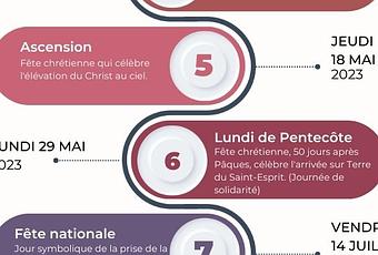 - Lundi 29 mai 2023 : Lundi de Pentecôte – fête chrétienne, cinquante jours après Pâques, nous célébrons l’arrivée sur Terre du Saint-Esprit. Ce jour est devenu la journée de solidarité : donc férié mais pas obligatoirement chômé.