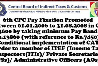 6e CPC Pay Fixation promue entre le 01.01.2006 et le 31.08.2008 dans le GP 4600 en prenant au minimum la tranche de rémunération Rs.13860 (en référence à R.s7450): Mise en œuvre conditionnelle de l’ordonnance CAT pour les membres de l’ITEF (inspecteurs de l’impôt sur le revenu (ITI) / Secrétaires privés (PS)/Agents administratifs (AO)