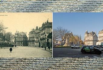 Les maisons de cette partie de la place ont pû être restaurées, par contre, la rue Jean-Jacques Rousseaux a été percée dans les ruines de l'immeuble de gauche.