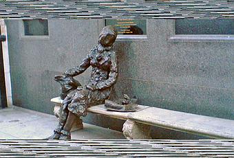 Elle représente une femme assise sur un banc avec un sac à main, un sac à provisions et un exemplaire du journal Liverpool Echo.