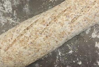 - au bout des mn de repos, mouiller le pain avec un peu d’eau ajouter des graines dessus et donner 3 coups de couteau