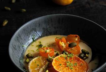 Au moment de servir, versez un peu de sirop sur les panna cotta, ajoutez les agrumes, un zeste de citron vert et quelques pistaches.