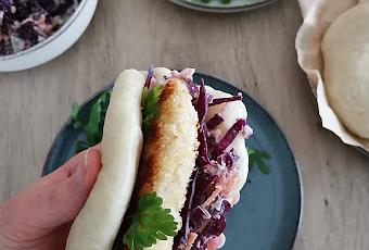 - Confectionner les gua bao en ouvrant le pain, u déposer 1 cs de condiment et une aiguillette de poulet pané.