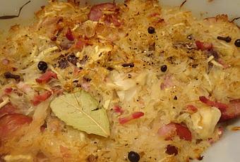 Couvrir avec l'autre moitié du mélange de choucroute, garnir avec le reste des clous de girogle, baie de genièvre et la deuxième feuille de laurier