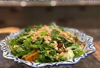 10. Enfin, verser la sauce satay, remuer à l'aide de baguettes. Pour le service, hacher grossièrement 2 cuillers à soupe de cacahuètes, ciseler la coriandre, découper finement les oignons verts et servez!