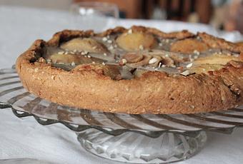 Mais bon, comme je suis une flemmarde, je suis repartie de l'idée, mais en la simplifiant au maximum : ici, les poires ne sont pas préalablement pochées, mais simplement posées crues dans l'appareil, qui, est simplement composé de crème de marrons et de yaourt de soja... J'avoue que jusqu'à la découpe, j'avais un peu des doutes sur la tenue de ladite garniture, mais en réalité, si on la laisse bien refroidir comme il faut, on obtient une texture soyeuse et fondante, qui se marie très bien avec les poires encore un peu fermes. La pâte, légèrement parfumée aux épices et aux notes torréfiées de noisette et de Gaudes apporte un vrai plus, et fait de ce dessert une douceur bien réconfortante...