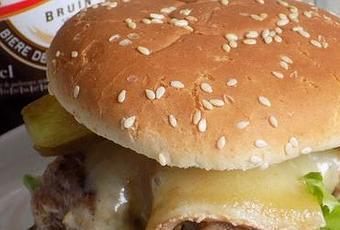 4) Couper le pain en deux. Garnir de quelques feuilles de salade, du steak, de la sauce BBQ et enfin de tranches de cornichons. Déguster sans attendre