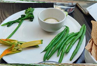 Il existe deux menus : un végétal et un "mixte", comprenant du végétal et de l'animal. Nous choisissons le premier car il correspond plus à la philosophie du lieu. Autant la vivre pleinement. La mise en bouche vous plonge directement dans l'ambiance, avec des légumes cuits al dente (pousses de brocoli et haricots verts) à tremper dans une huile aux herbes . La courgette-fleur, elle, était crue. Il y avait aussi des crackers aux graines de lin.