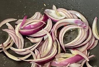 Dans un wok ou une grande poêle, faites chauffer l'huile d'olive puis faites revenir l'oignon rouge épluché et émincé.